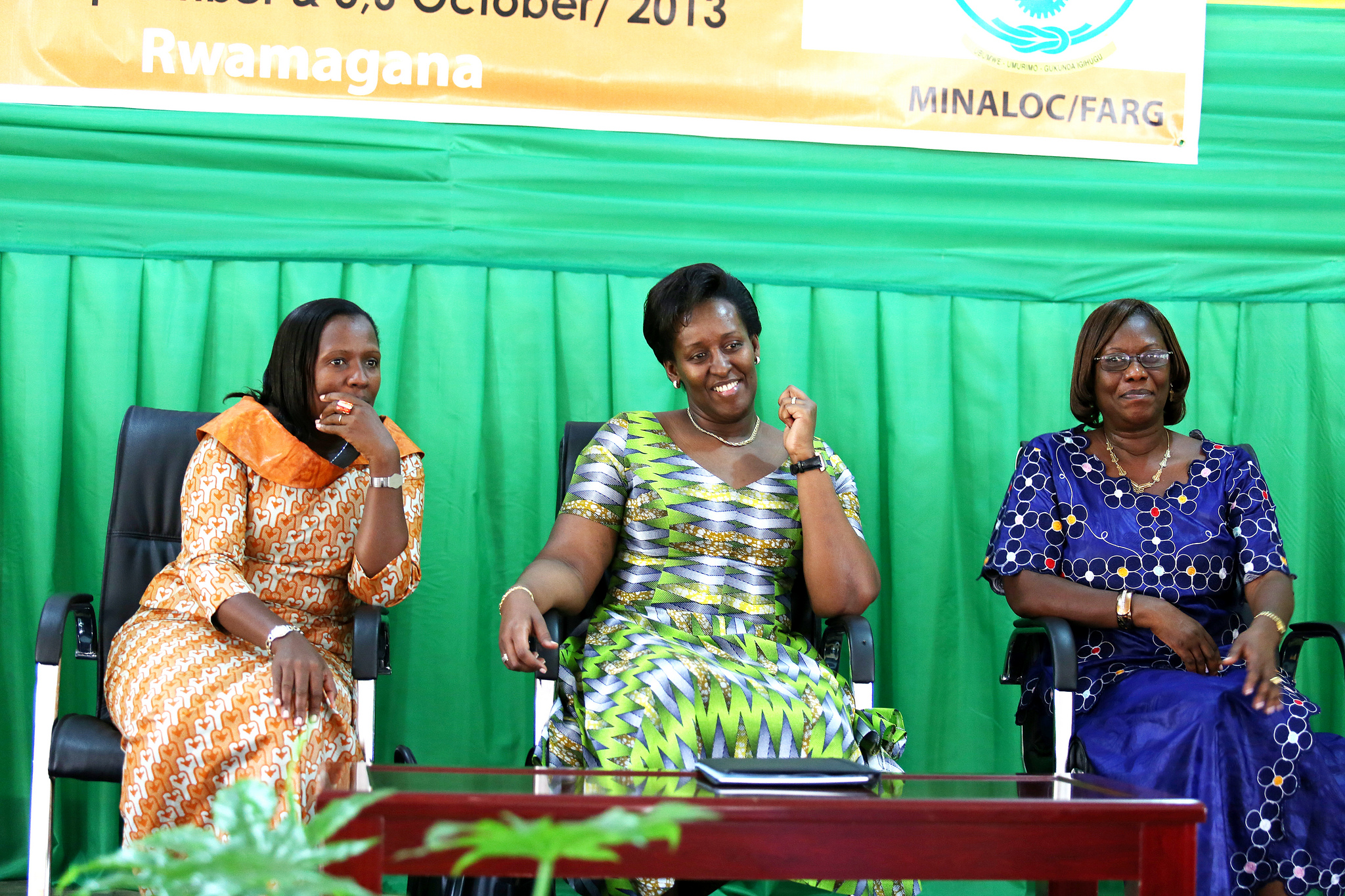 | Description: | First Lady Mrs. Kagame (center), Dr. Alivera Mukabaramba , Minister of State in the Ministry of Local Government in Charge of Social Affairs(Right) and the Governor of Eastern Province Odette UWAMARIYA(Left) at AERG girls retreat closing ceremony, 1 october 2014. |