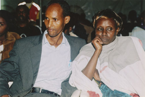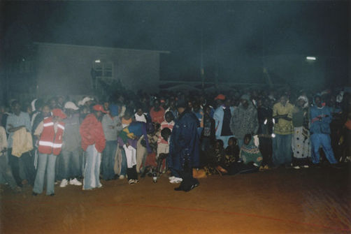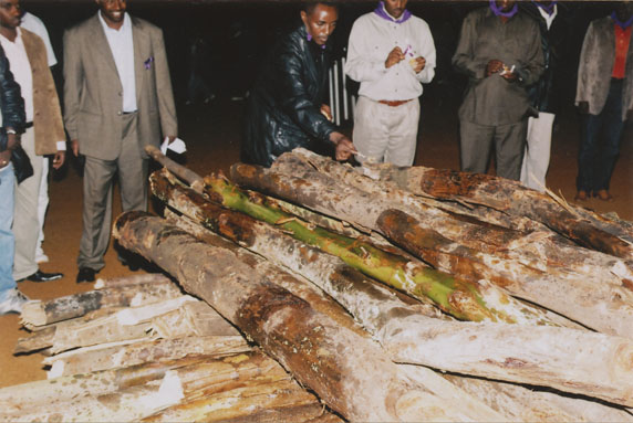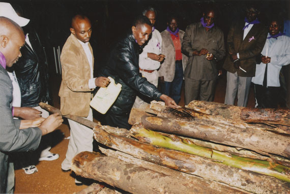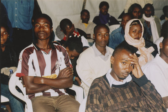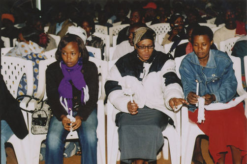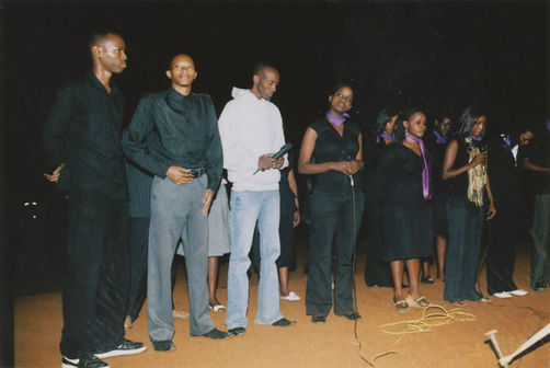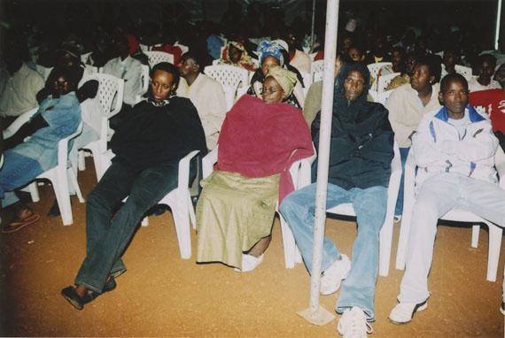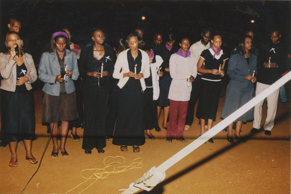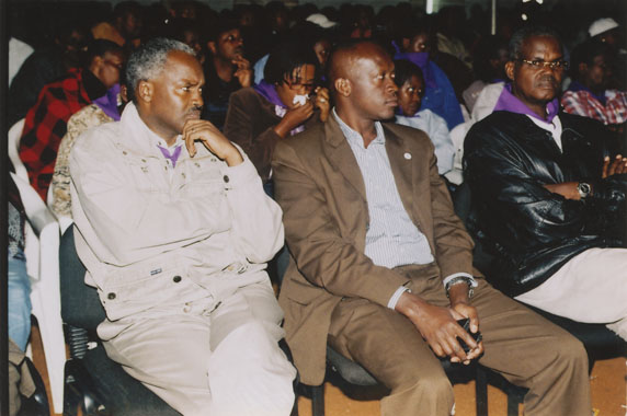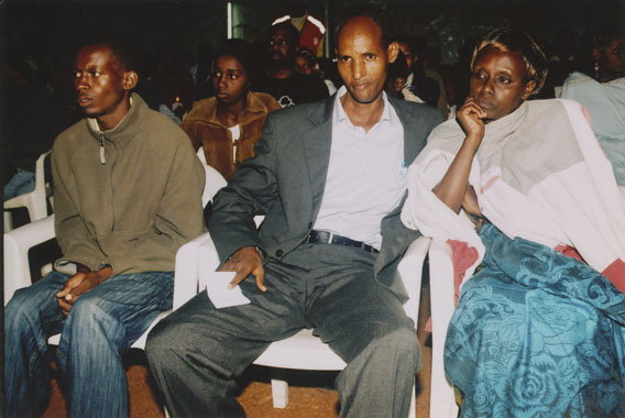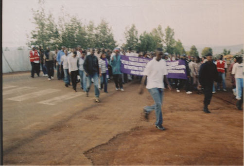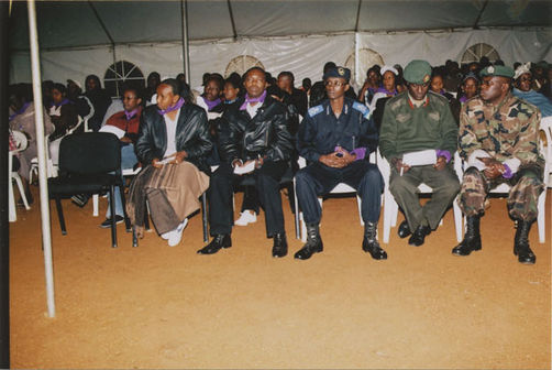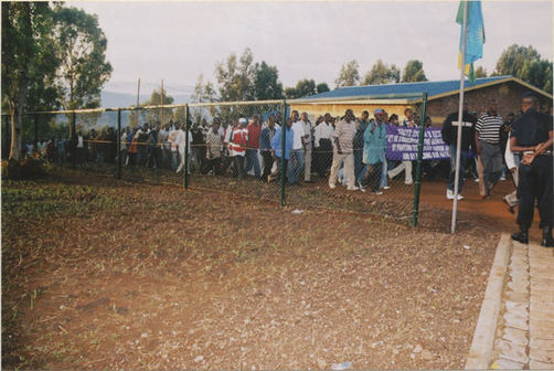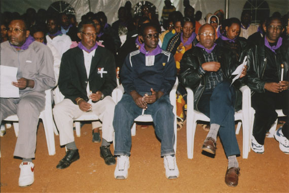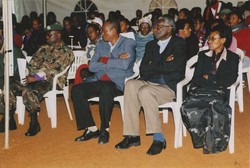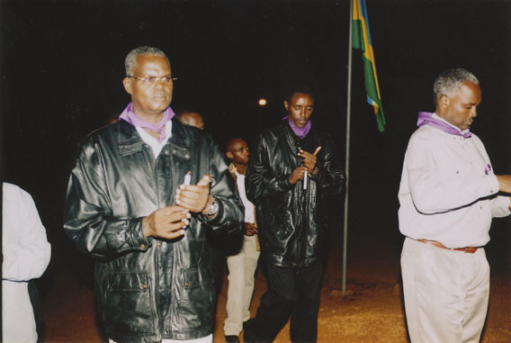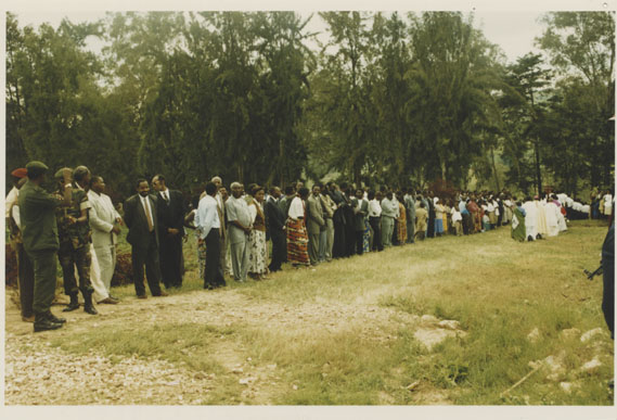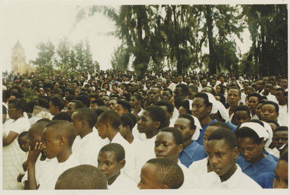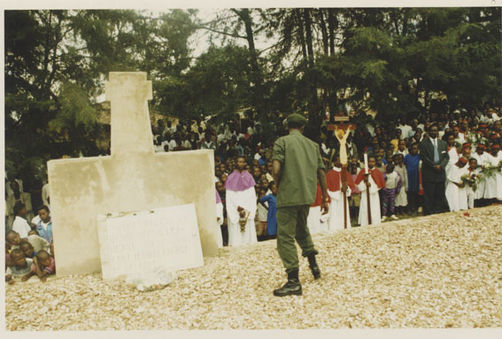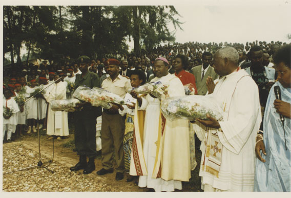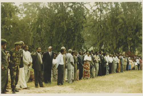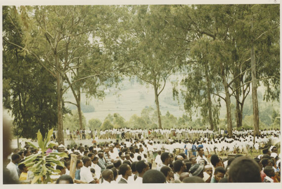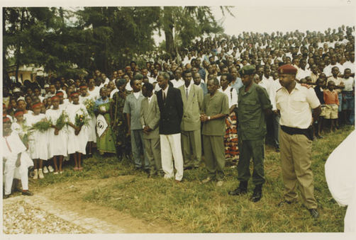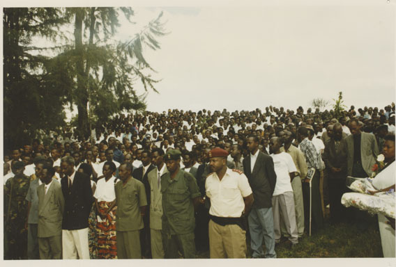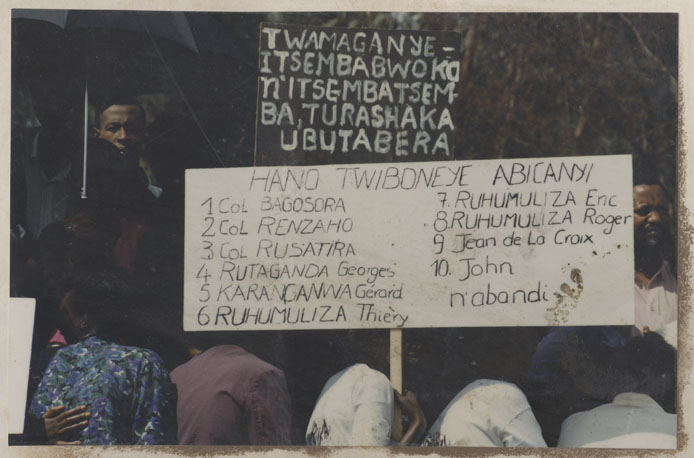 | Description: | Commemoration photograph of a crowd of people. Two people are holding signs that read: "TWAMAGANYE ITSEMBABWOKA N'ITSEMBATSEMBA, TURASHAKA UBUTABERA" and "HANO TWIBONEYE ABICANYI. 1 COL BAGOSORA, 2 COL RENZAHO, 3 COL RUSATIRA, 4 RUTAGANDA Georges, 5 KARANGANWA Gérard, 6 RUHUMULIZA Thièry, 7. RUHUMULIZA Enc, 8. RUHUMULIZA Roger, 9 Jean de La Croix, 10. John n'abandi." |