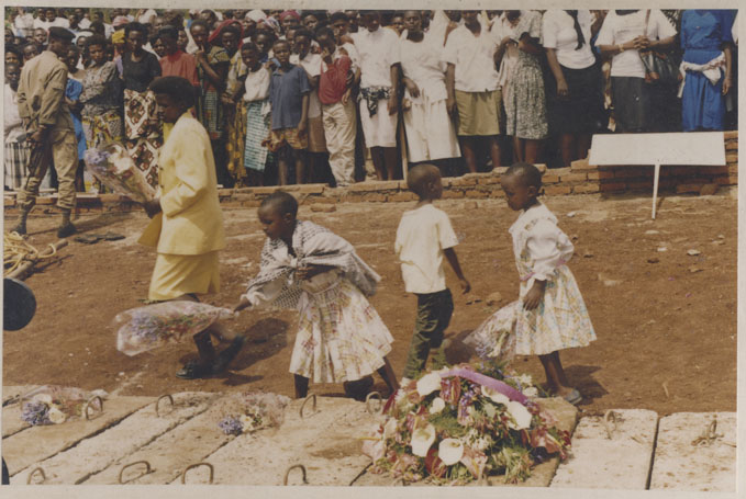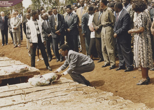 | Description: | Commemoration ceremony. Crowd of people standing by mass grave. Man in grey suit is laying a wreath on the grave. Paul Kagame is present. |