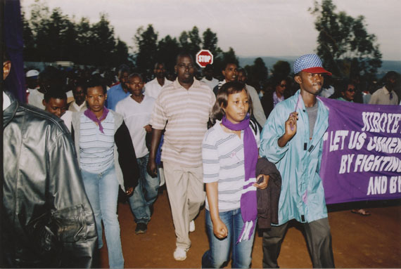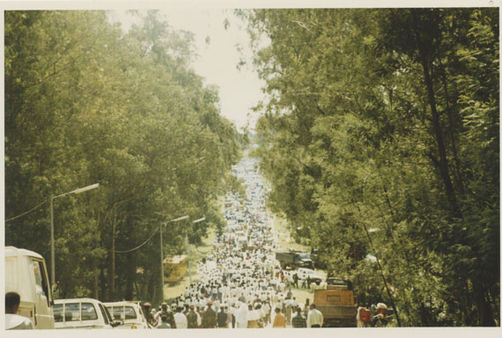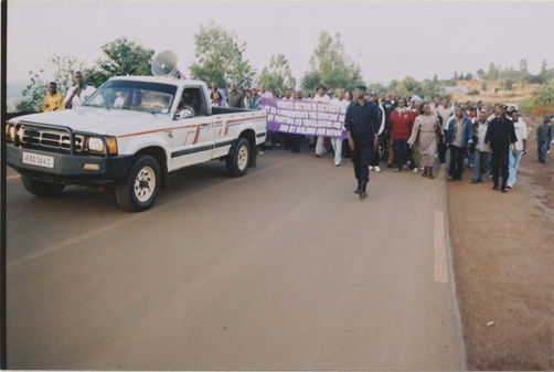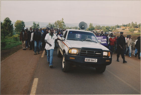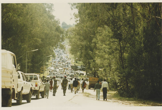 | Description: | Commemoration photograph of three police officers and a white truck leading a crowd of people of the road to Ibuka's headquarters. |