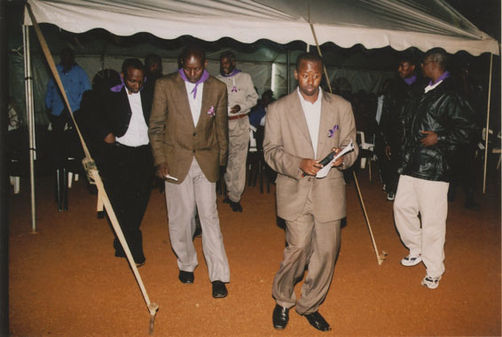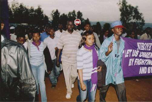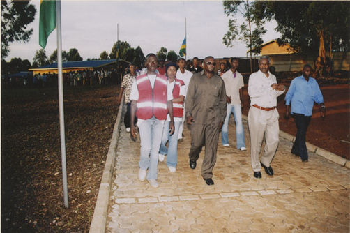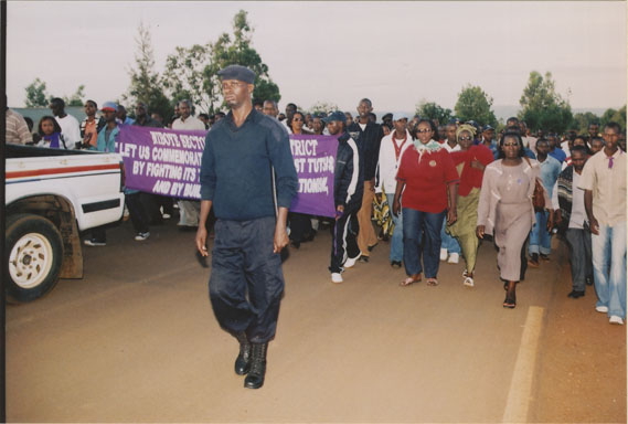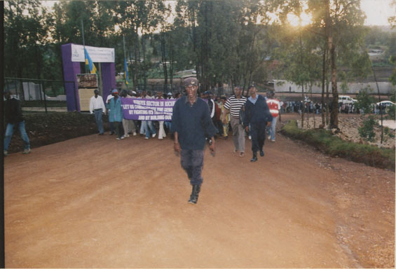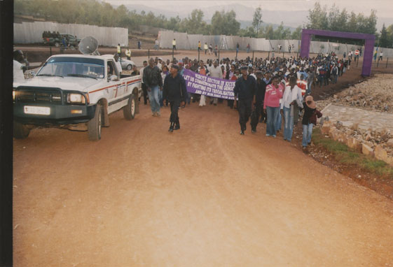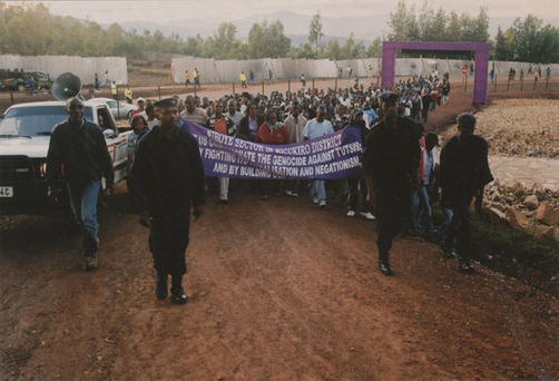 | Description: | Commemoration photograph of two police officers, two civilians in black shirts, and a white truck leading a crowd of people up the read to Ibuka's headquarters |