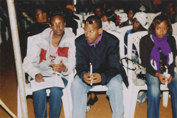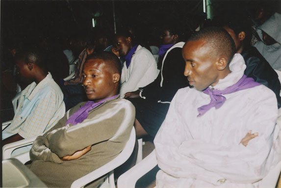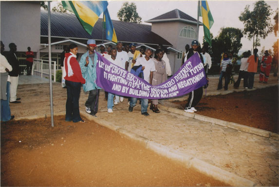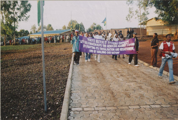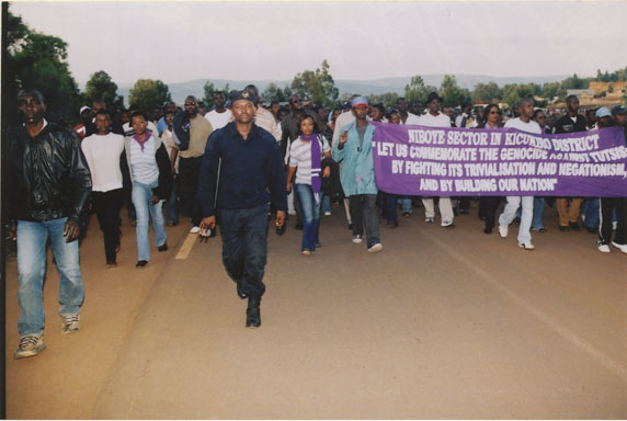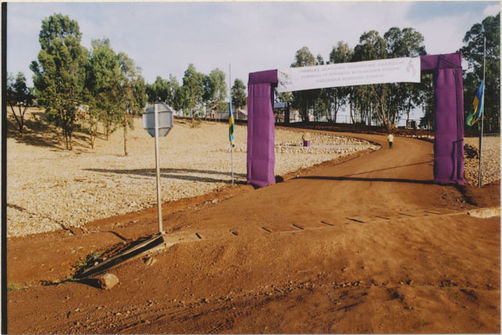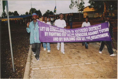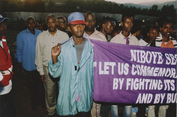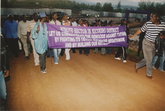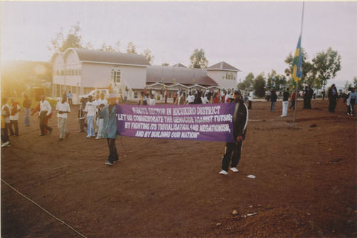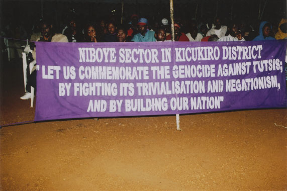 | Description: | Commemoration photograph of a purple banner reading, "Niboye sector in Kicukiro district 'Let us commemorate the genocide against Tutsis; but fighting its trivialization and negationism, and by building our nation." |