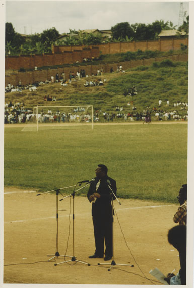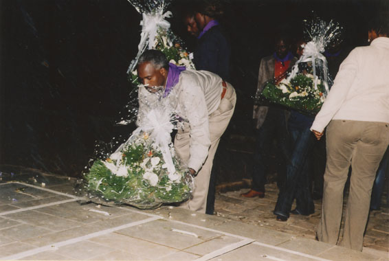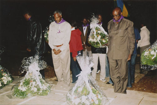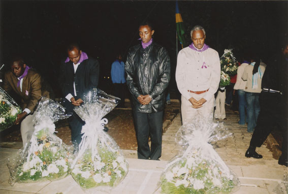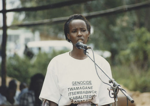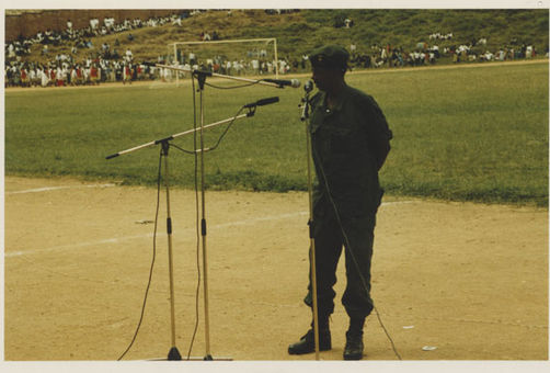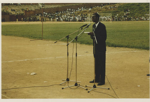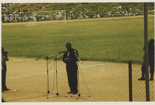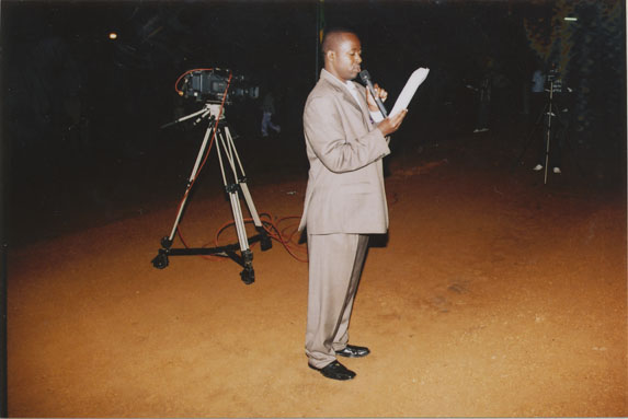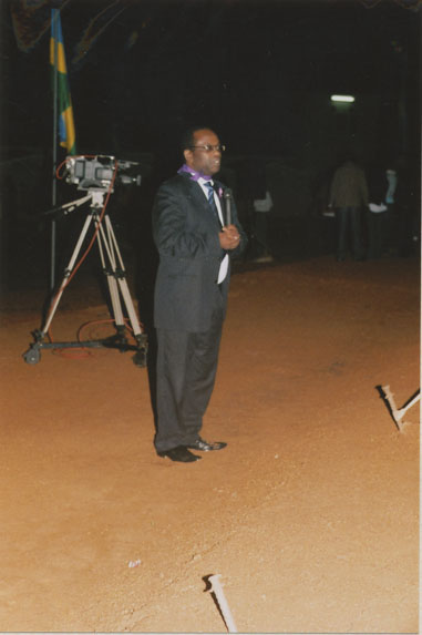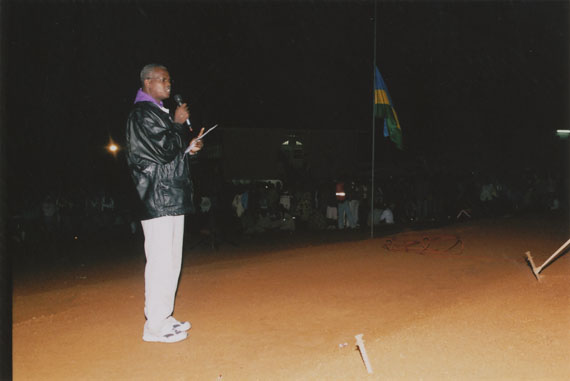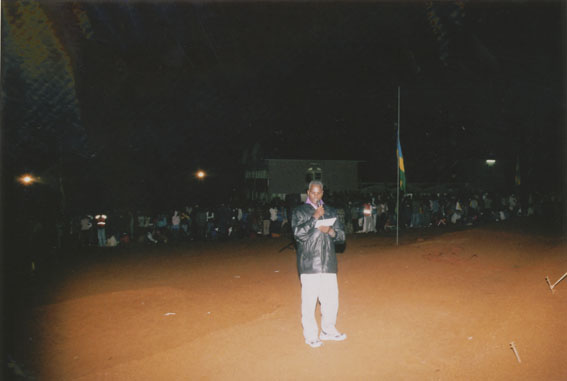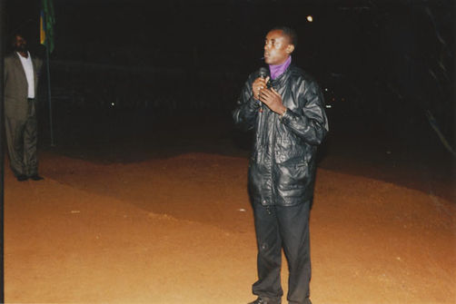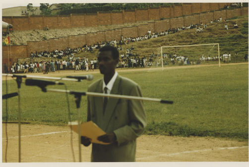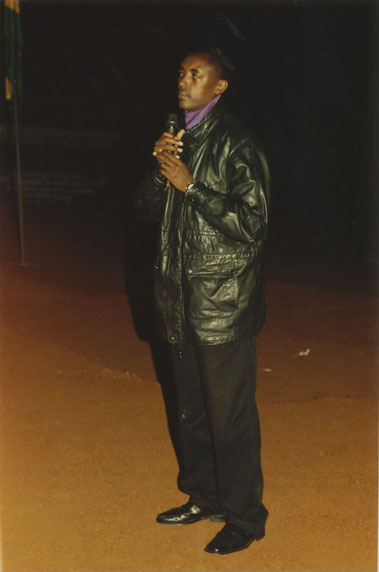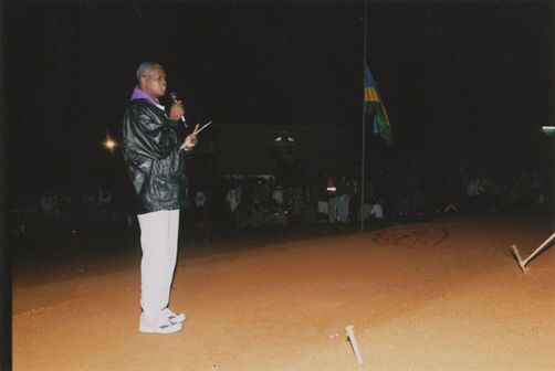| Description: | Commemoration photograph of a man in a black leather jacket in the centre of the image, holding a microphone and a sheet of paper. A Rwandan flag is visible in the background. |