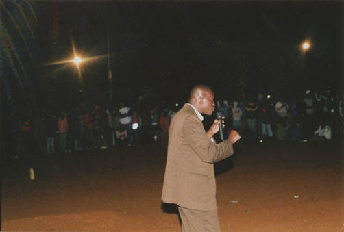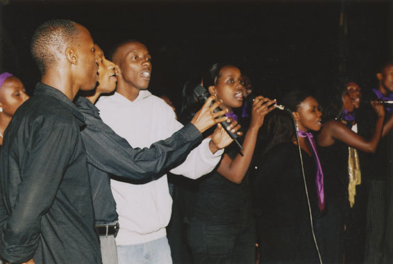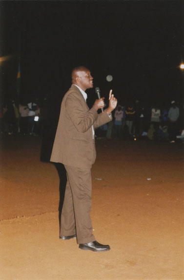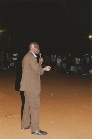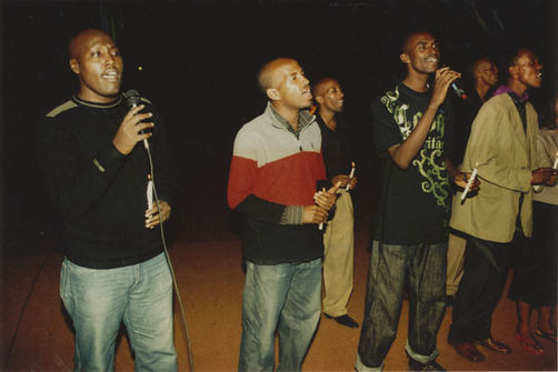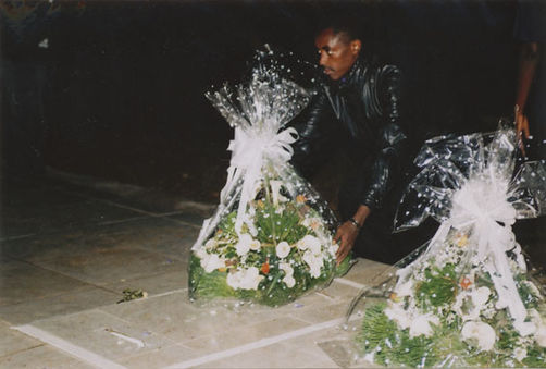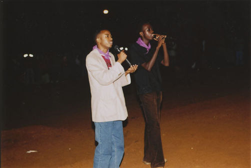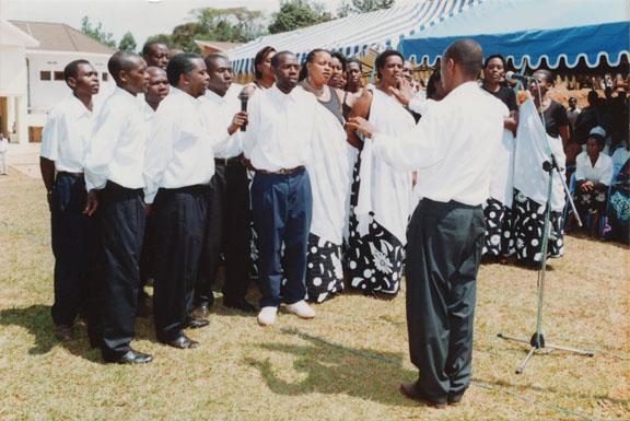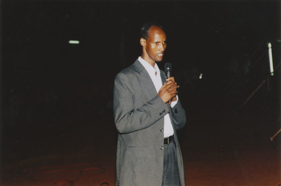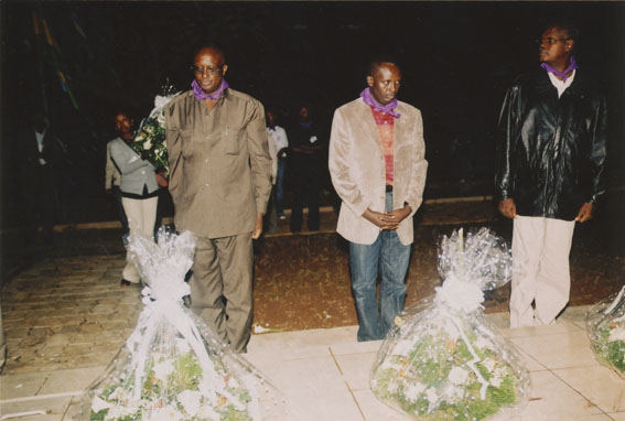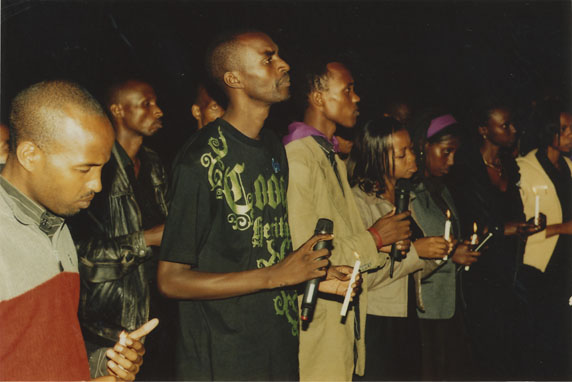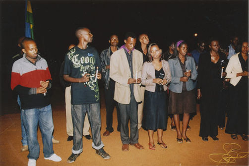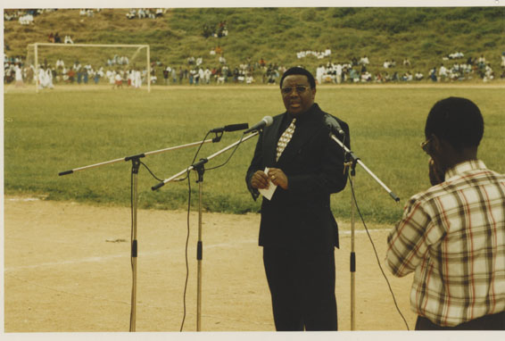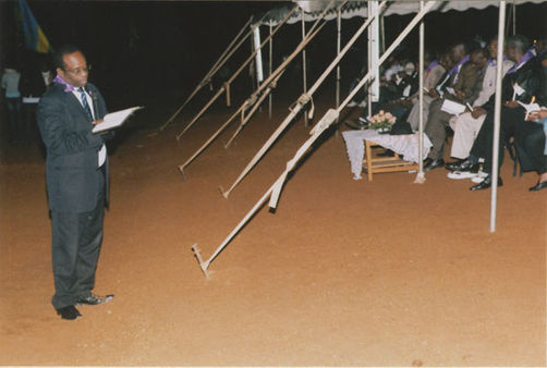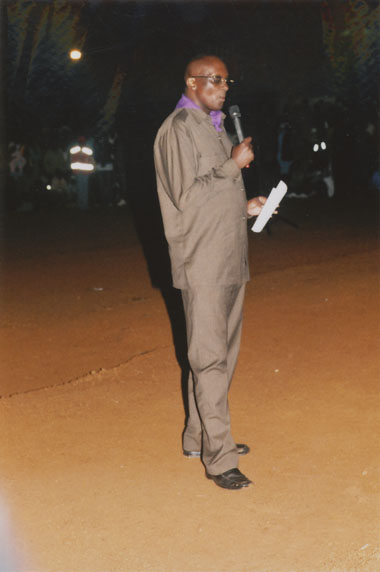 | Description: | Commemoration photograph of a man in a black leather jacket in the centre of the image, holding a microphone and a sheet of paper. A Rwandan flag is visible in the background. |