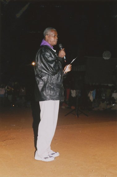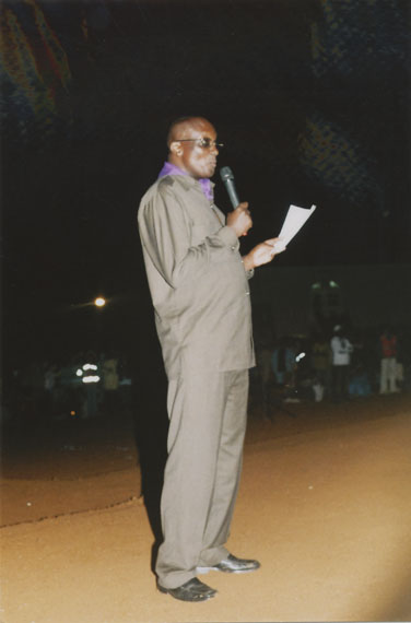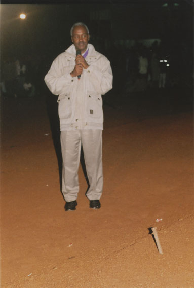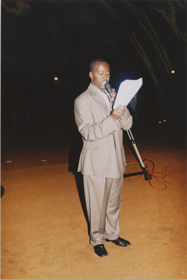 | Description: | Commemoration photograph of a man in beige shirt and pants holding a microphone and a piece of paper. |
