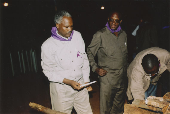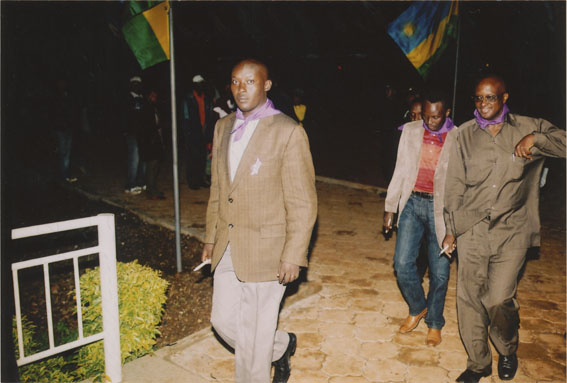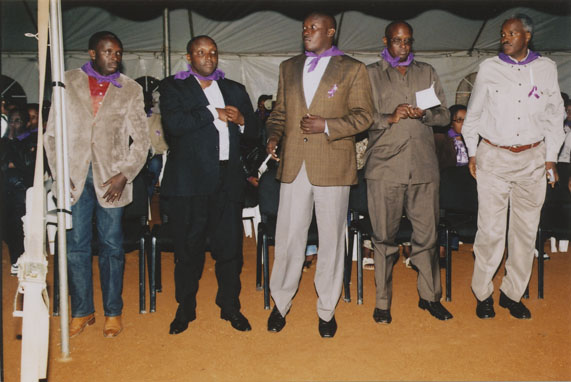| Description: | Photograph of Paul Kagame, Joseph Habineza and a third man all wearing black suits. Kagame is wearing a purple tie, Habineza is wearing a purple kerchief around his neck and the third man has a purple kerchief poking out of his pocket. |