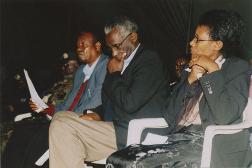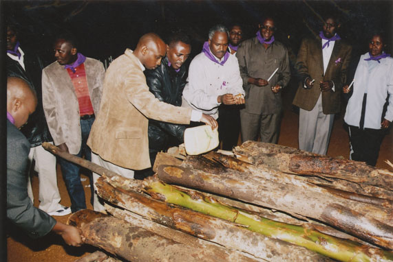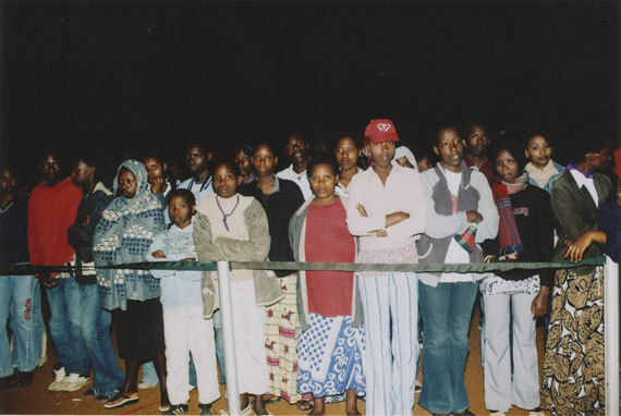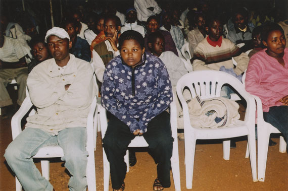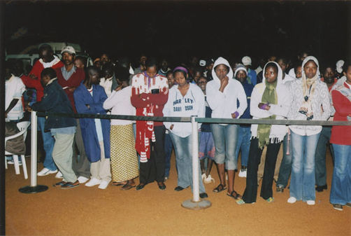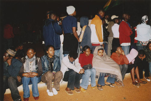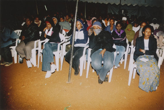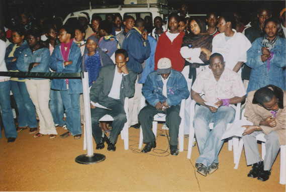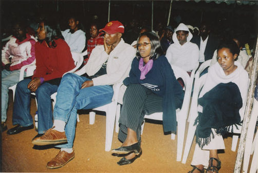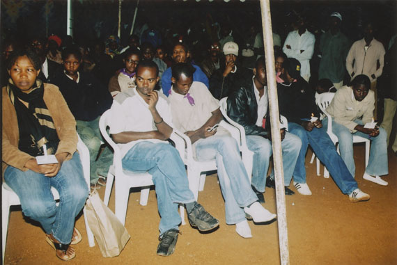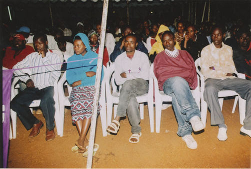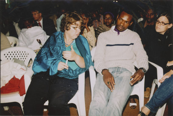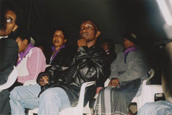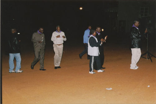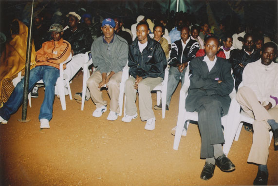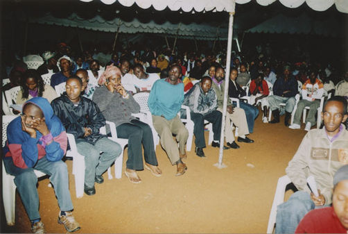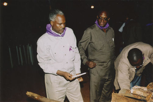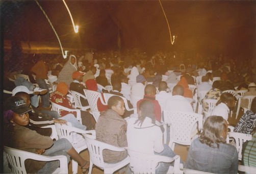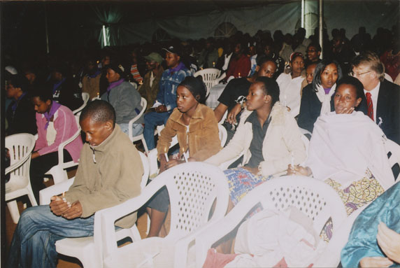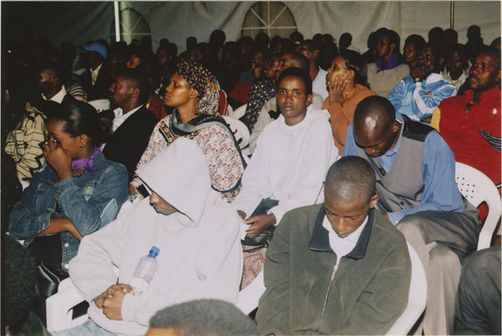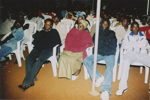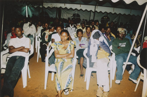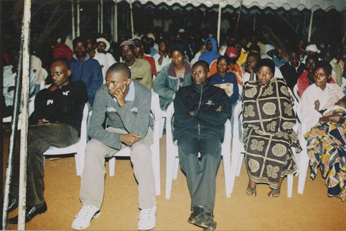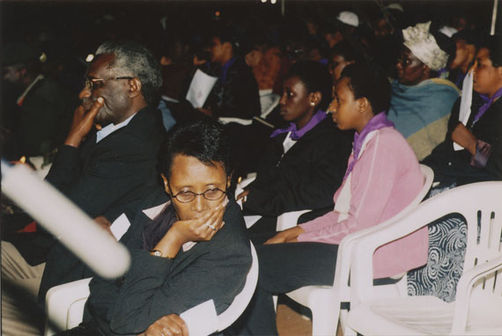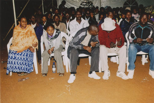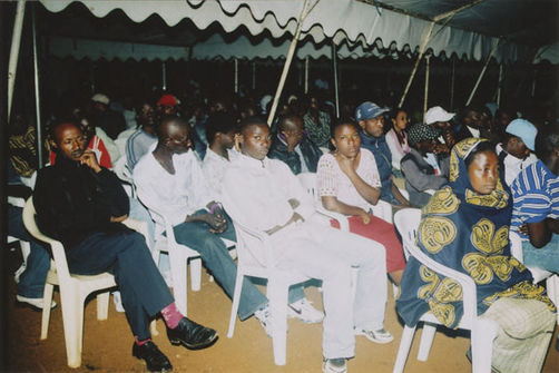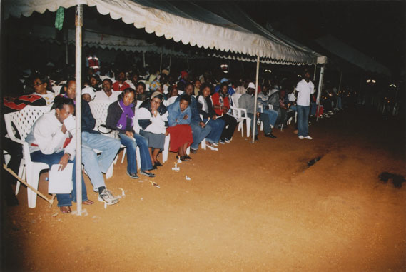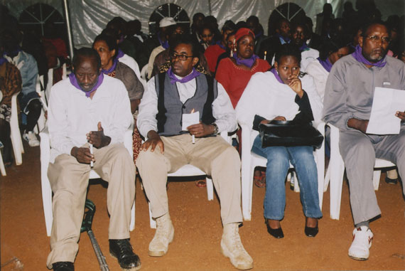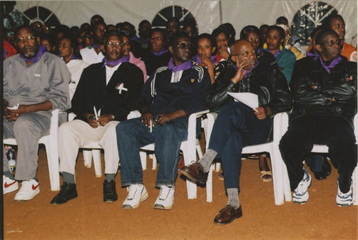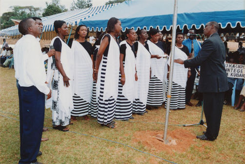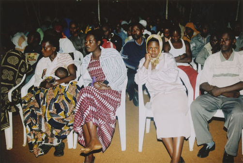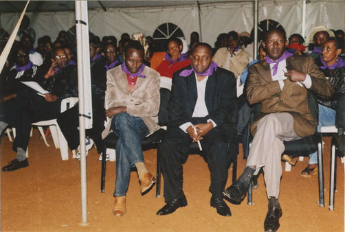 | Description: | Commemoration photograph of a crowd of people, one wrapped in blue and yellow African fabric, seated in a tent |