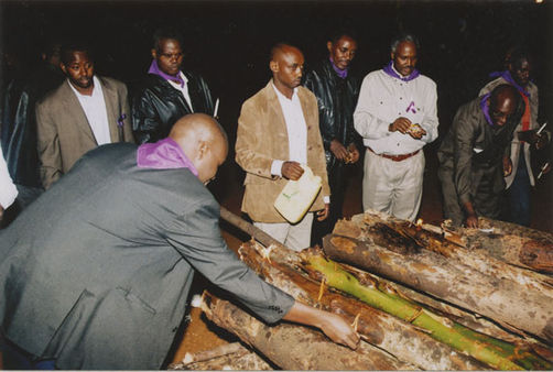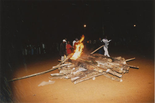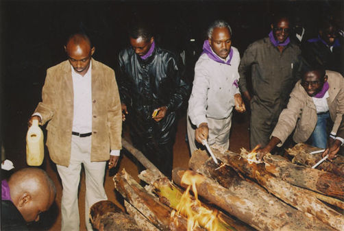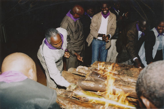 | Description: | Commemoration photograph of a man in a white dress shirt and purple scarf bent down near fire wood while flames rise. The backs of two men's heads are visible in the foreground. |
