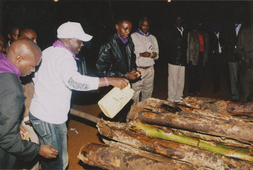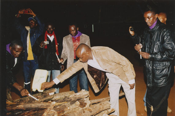 | Description: | Commemoration photograph of a man in a brown suit jacket holding a jerry can and looking at his feet while men hold candles to fire wood. |