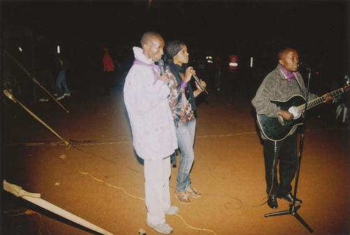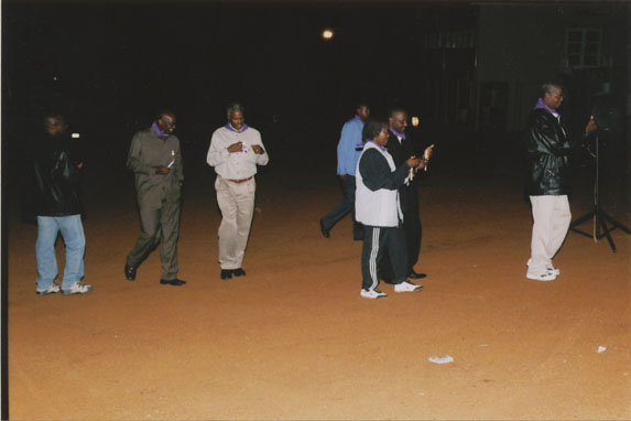 | Description: | Commemoration photograph of people preparing to sing, one in a white sweatshirt and holding a microphone, another in a black dress shirt and touching his belt. |