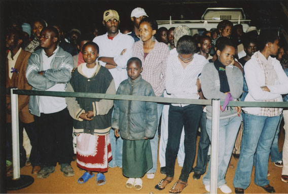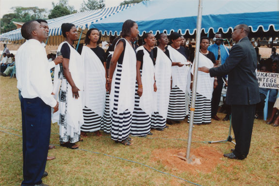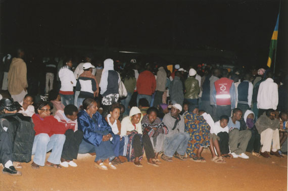 | Description: | Commemoration photograph of two crowds of people, one seated and facing the camera, the other standing and facing away, next to a Rwandan flag. |