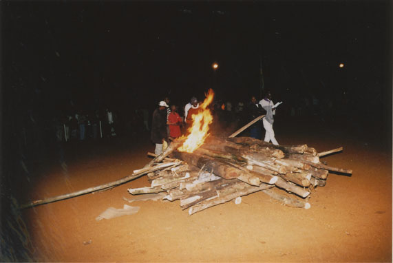| Description: | Commemoration photograph of a small crowd of people standing near a pile of burning fire wood. |