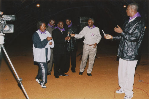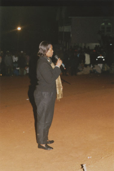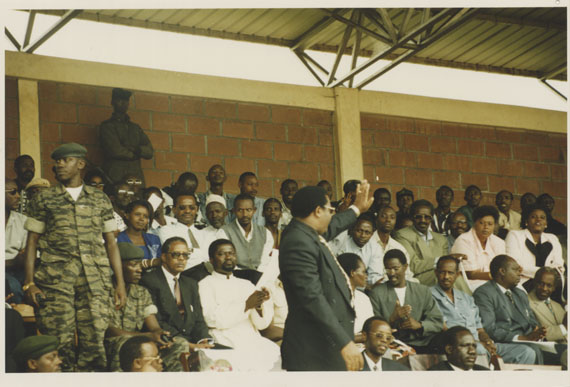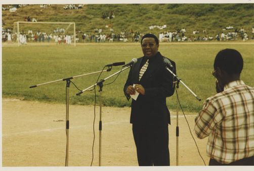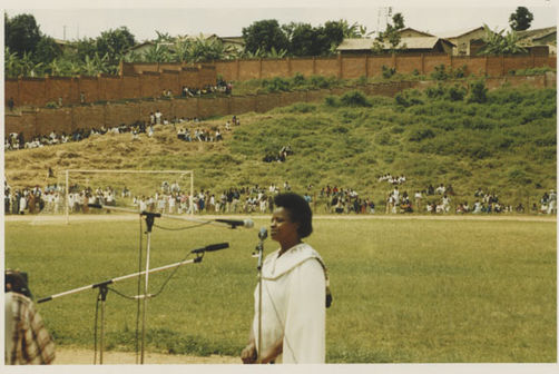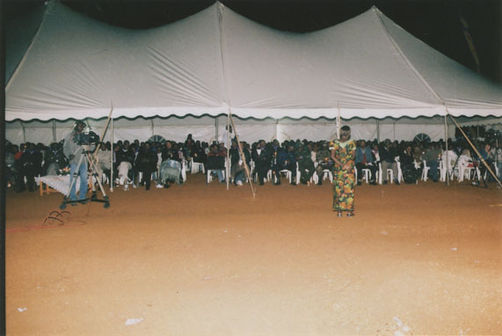 | Description: | Commemoration photograph of a woman in African dress being filmed by a videocamera while addressing a crowd of people in a tent. |