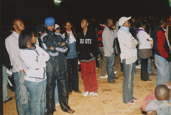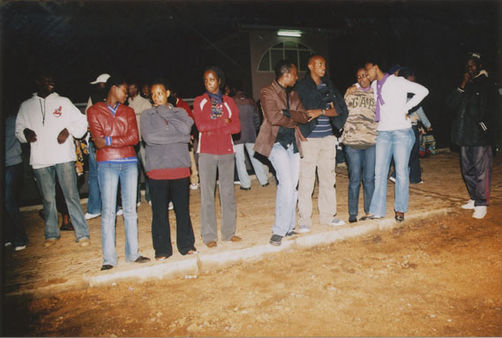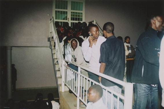 | Description: | Commemoration photograph of a crowd of people, one on a cell phone, seated on the steps of Ibuka's headquarters. |