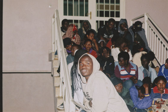 | Description: | Commemoration photograph of a crowd of people, one in a white hooded sweatshirt, seated on the steps of Ibuka's headquarters. |