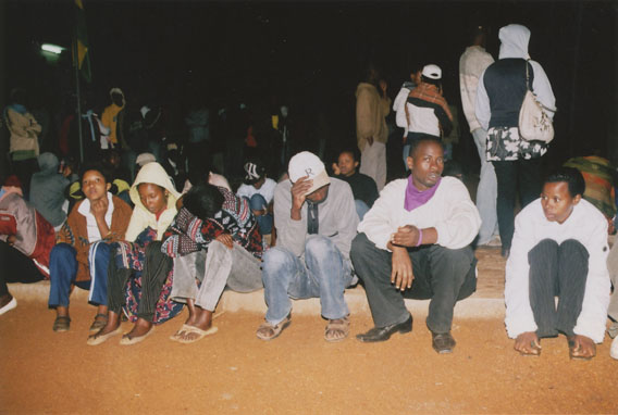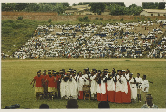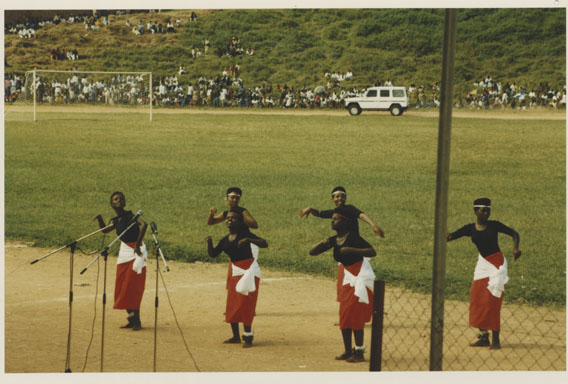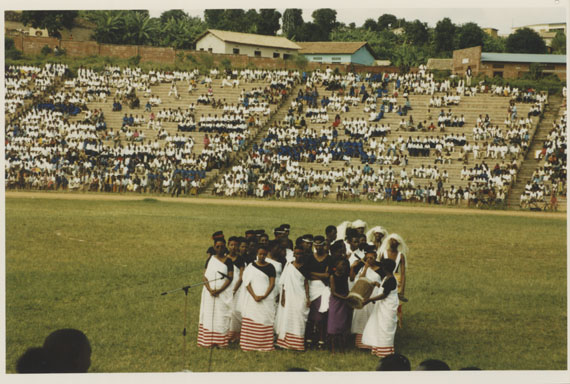 | Description: | Commemoration photograph of an intore troupe performing in an outdoor stadium wearing white skirts. |