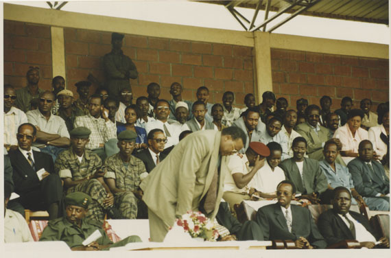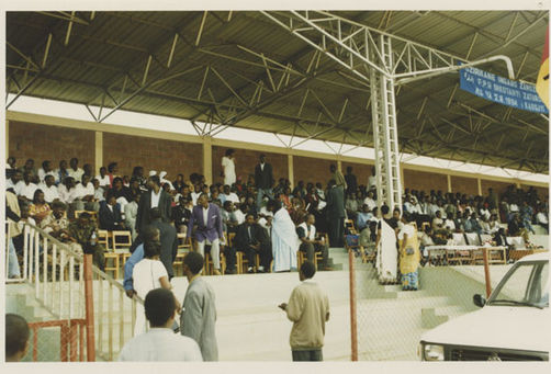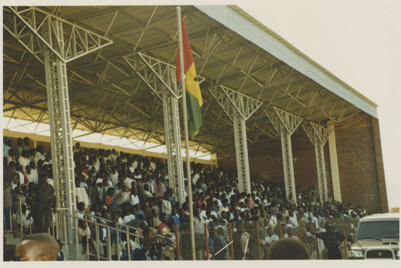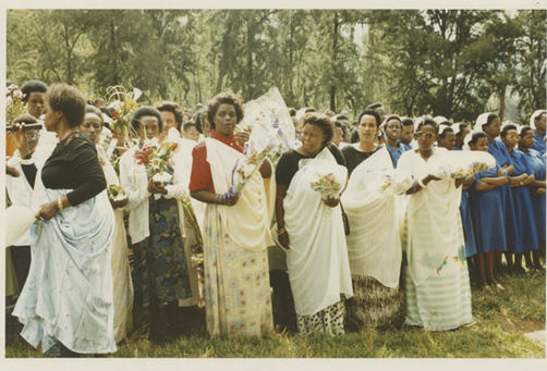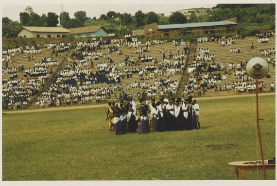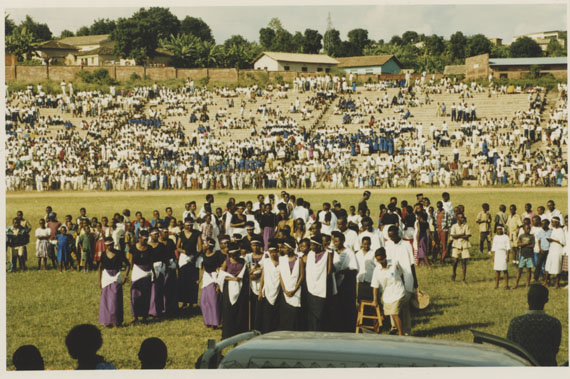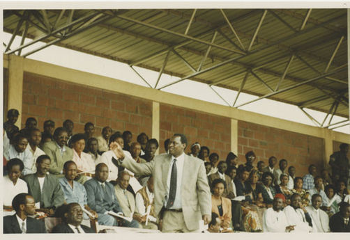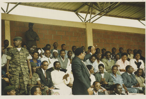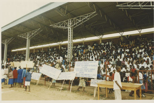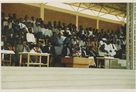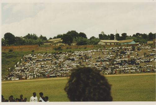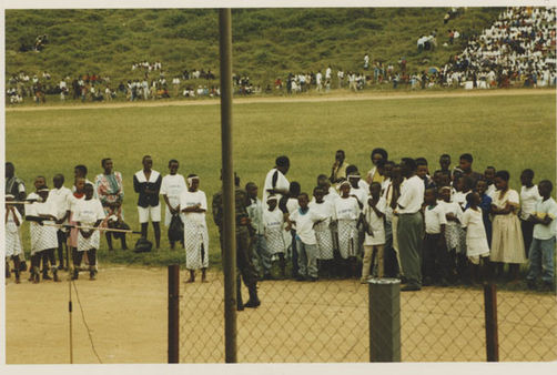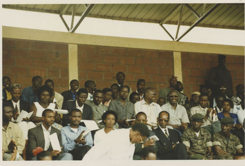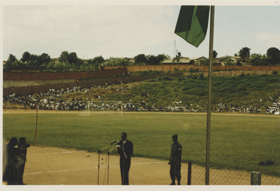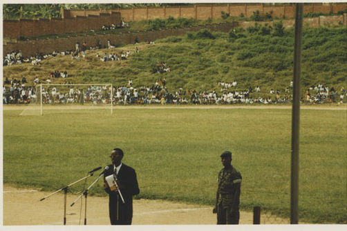 | Description: | Commemoration photograph of a crowd of people standing in an outdoor stadium with the old Rwandan flag in the foreground. |