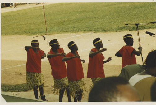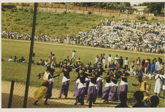 | Description: | Commemoration photograph of an intore troupe performing in an outside stadium wearing purple skirts. |