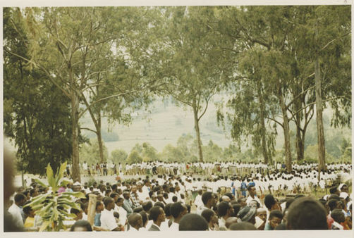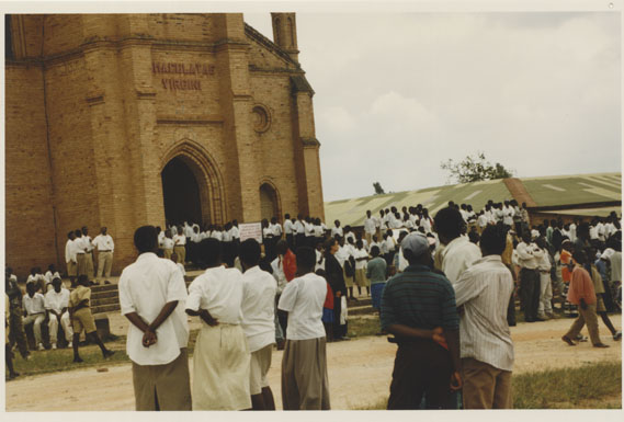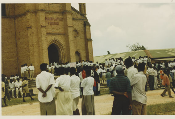 | Description: | Commemoration photograph of a crowd of people standing in front of Kabgayi Catheral. |