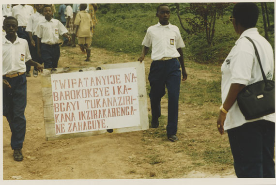 | Description: | Commemoration photograph of two boys in school uniforms carrying a sign that reads, "TWIFATANYIJE N'ABAROKOKEYE I KABGAYI TUKANAZIRIKANA INZIRAKARENGANE ZAHAGUYE." |