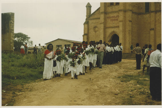 | Description: | Commemoration photograph of a a group of children wearing white robes and red head bands walking away from Kabgayi Cathedral. |