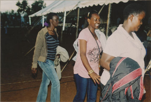 | Description: | Commemoration photograph of 6 female intore dancers wearing red skirts that are dancing outside. |