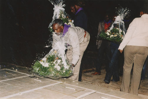 | Description: | Commemoration photograph of two men in purple scarves bowing to baskets of flowers on mass grave. |