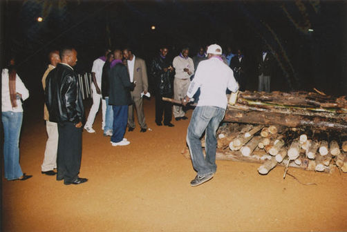 | Description: | Commemoration photograph of a man in a white shirt and white baseball hat dousing fire wood with liquid from a jerry can. |