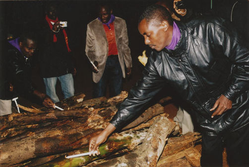 | Description: | Commemoration photograph of a man in a black leather jacket holding a candle to fire wood. |