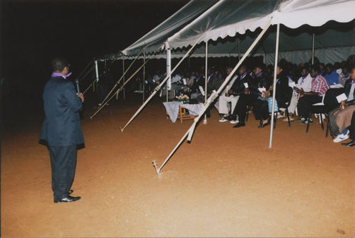 | Description: | Commemoration photograph of a man with a microphone speaking to a tent full of people. |