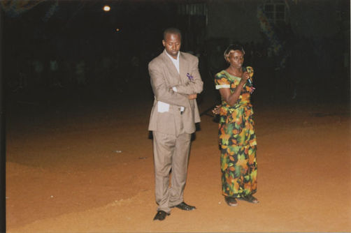 | Description: | Commemoration photograph of a woman in African dress holding a microphone and standing next to a man in a browns suit. |
