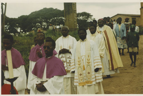 | Description: | Commemoration photograph of a procession of priests with a bishop in the back of the line. |