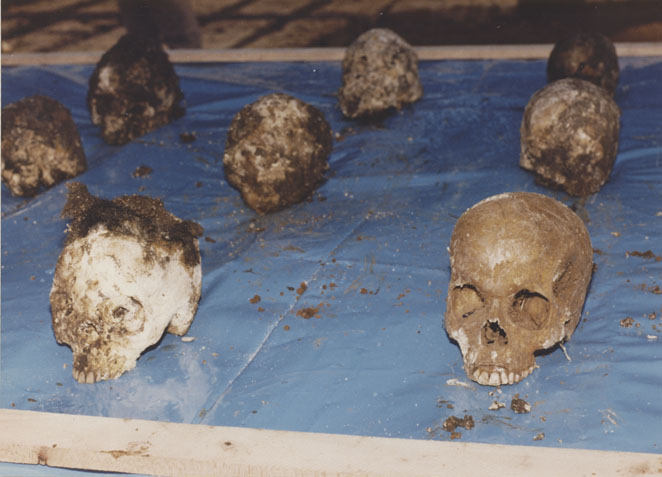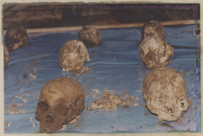 | Description: | Photograph of exhumed skulls laying on a blue tarp. |