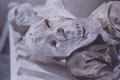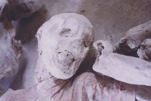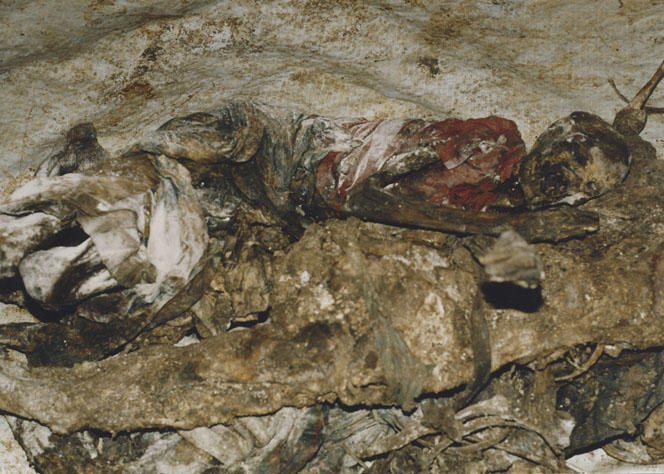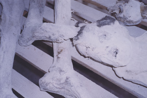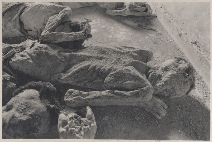 | Description: | Photograph of a room full of preserved human remains laying on the floor. |