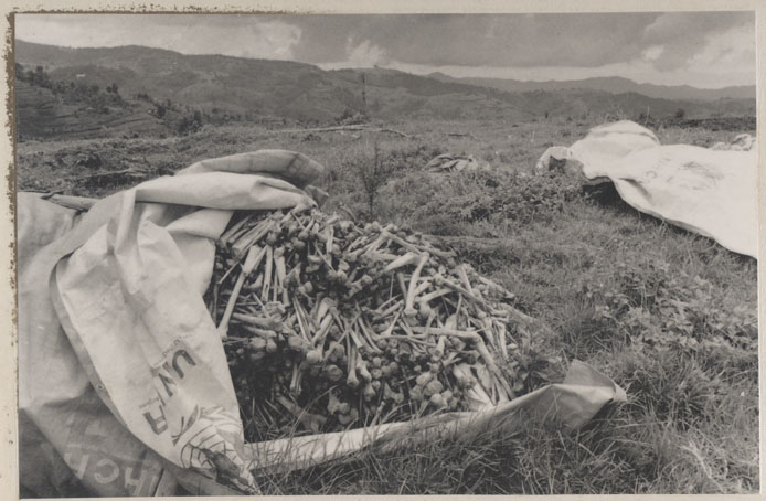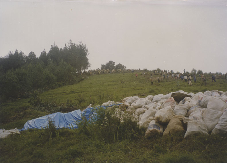 | Description: | Photograph of burlap sacks containing human remains laying on the side of a hill at Bisesero. |
