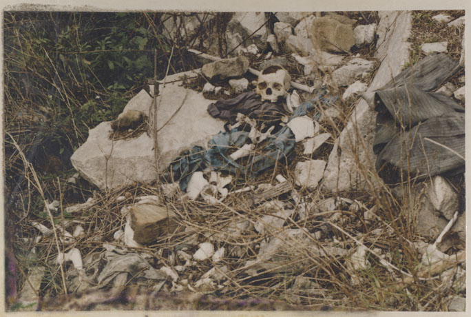 | Description: | Photograph of human remains laying on the ground. |