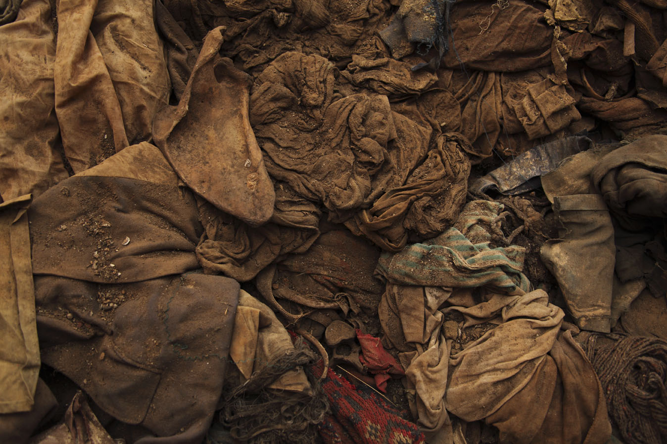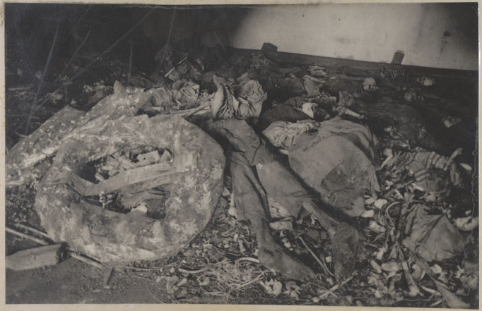 | Description: | Close-up photograph of a pile of victims' clothes. Shoulder blade, rib bones and a vertebrae are visible in the pile. |