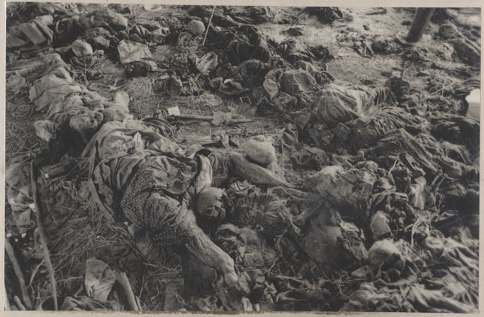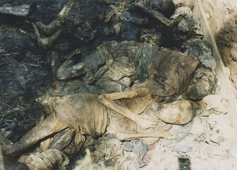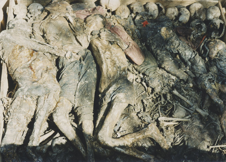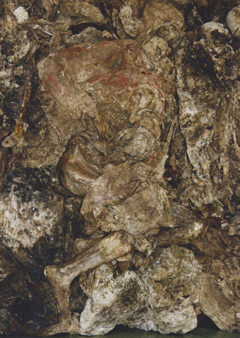 | Description: | Photograph of a pile of exhumed decomposing human remains. |
