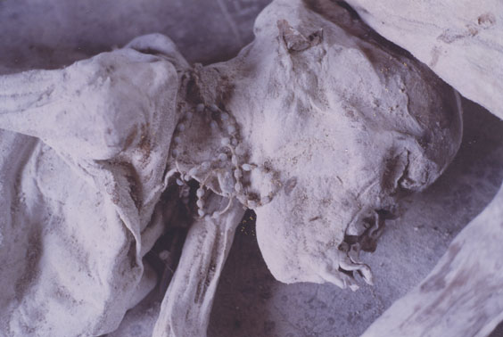 | Description: | Photograph of the head of a preserved corpse wearing a white beaded necklace. Body is laying on it's side on the floor. |