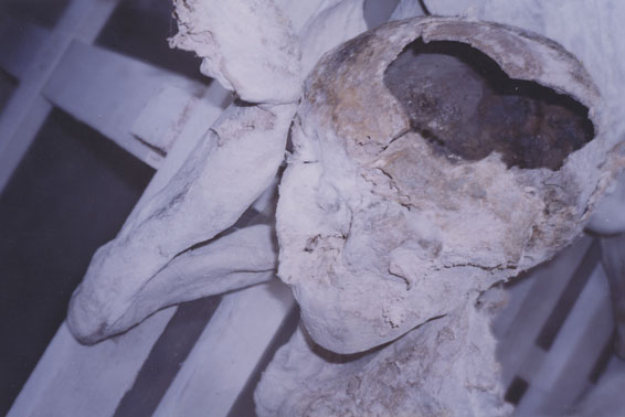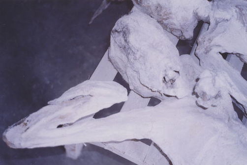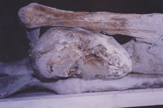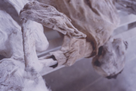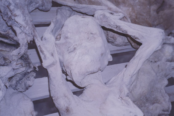 | Description: | Photograph of the head, feet and legs of preserved corpses. Two tufts of hair remain on the visible head. Bodies are laying on a wooden table. |