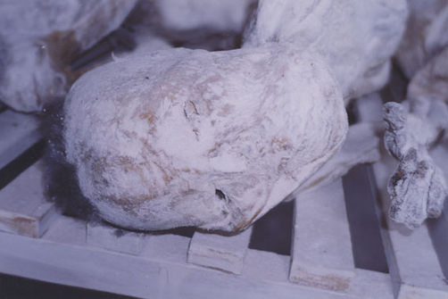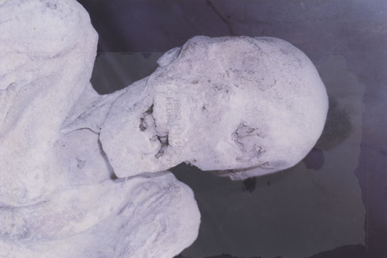 | Description: | Photograph of the head of a preserved corpse. Body is laying on it's back on the floor. |