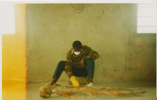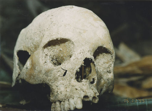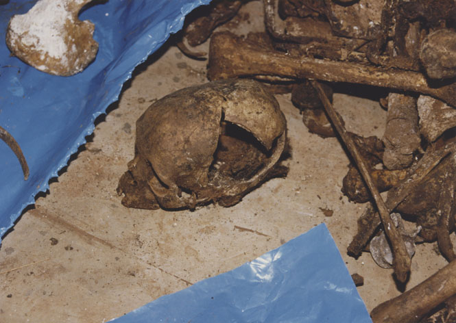 | Description: | Photograph of human remains laying on the floor of a building next to a blue tarp. Skull with a large hole in the left side is in the middle of the photograph. Gatandara, Cyangugu. |