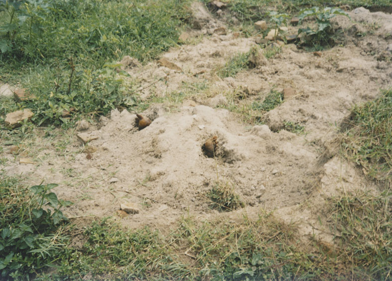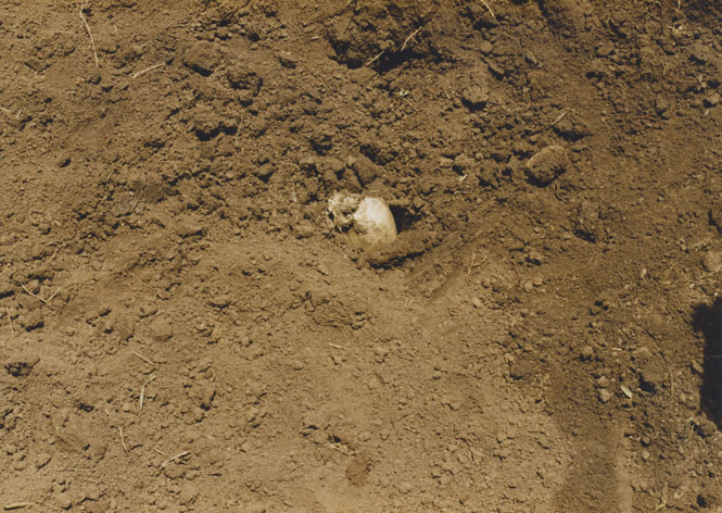 | Description: | Photograph of mounds of freshly disturbed soil with a partially exposed skull visible. |