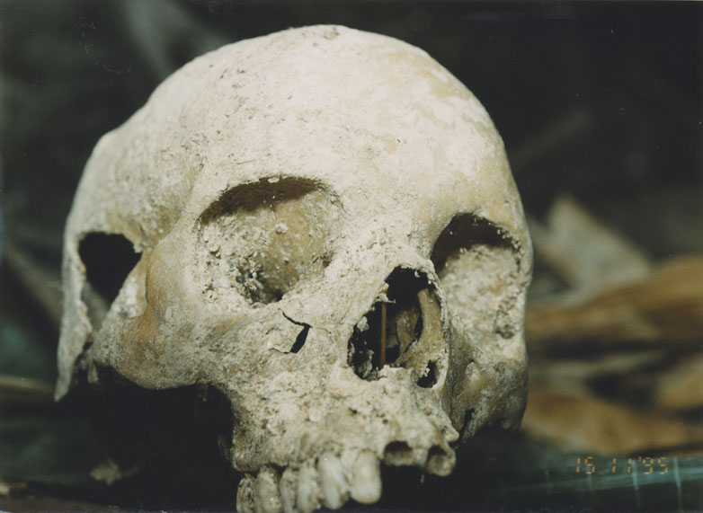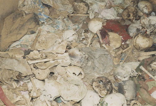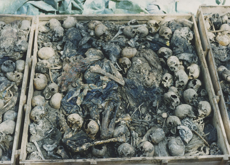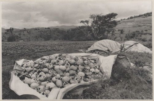 | Description: | Photograph of a pile of skulls laying on UNHCR tarps on a hillside. Two mounds covered in tarps are visible behind the pile of skulls. |