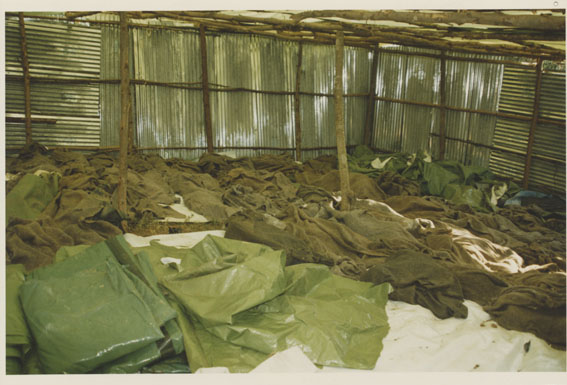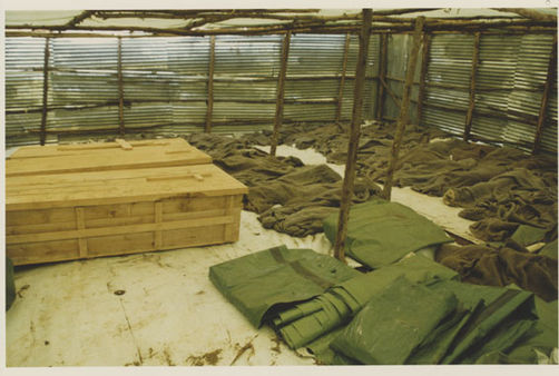 | Description: | Photograph of the interior of a room made from corrugated metal and wooden poles. Green tarps and bodies covered by green blankets are laying on the ground. |
