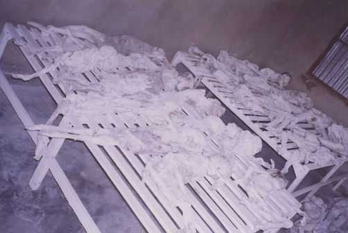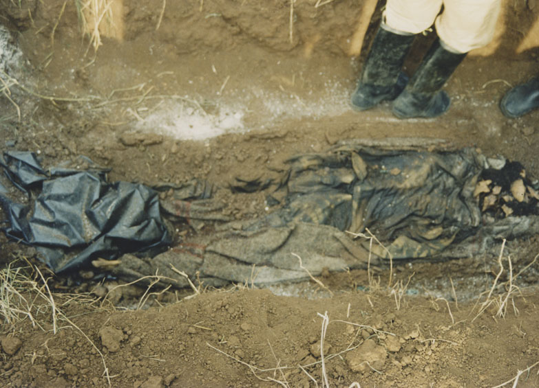 | Description: | Photograph of exhumed decomposing remains laying on white UNHCR tarps. Body in foreground is laying on its side wearing stripped trousers. |