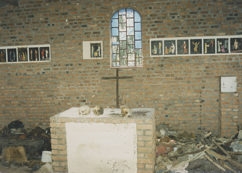 | Description: | Photograph of the interior of Ntarama Church. Three skulls are laying on the alter. |