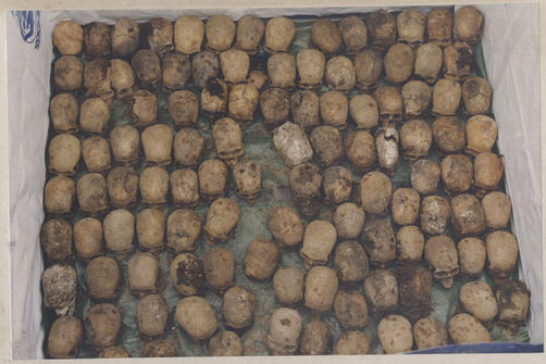 | Description: | Photograph of a mass grave of skulls taken from above. Skulls have been arranged in rows and are laying on a green tarp. |