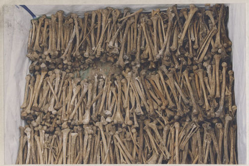 | Description: | Photograph of a mass grave full of arm and leg bones taken from above. Bones have been arranged in rows and are laying on a green tarp. |