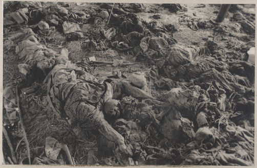| Description: | Photograph of five decomposing bodies laying face-down on the ground outside. |